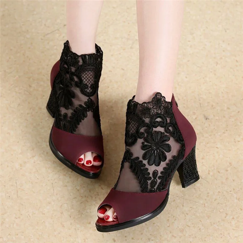 Lucyever 2019 Summer New Elegant Brand Mesh Sandals Crystal Peep Toe Sandals Woman Thick High Heels Breathable Ankle Boots