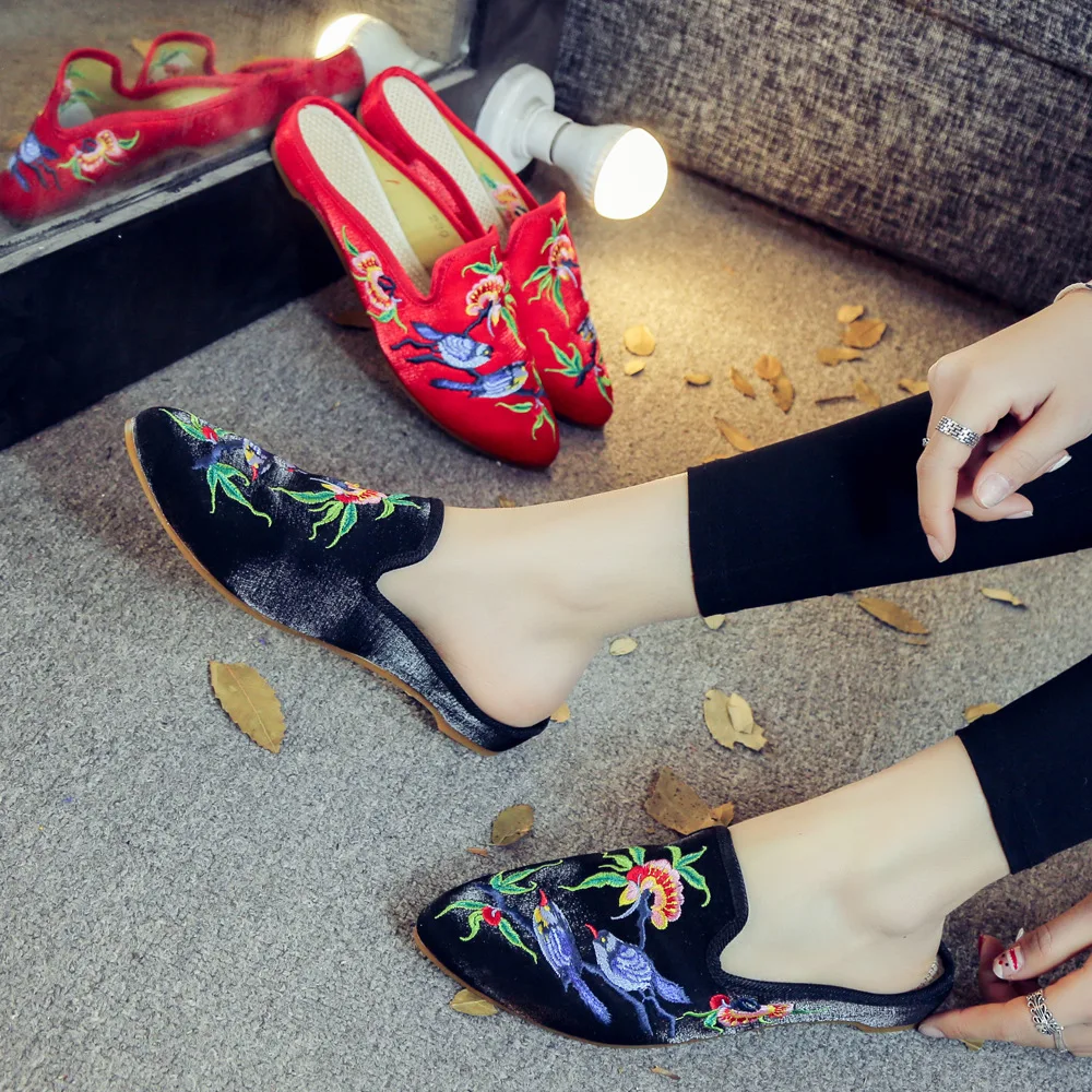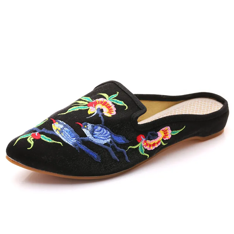Veowalk Chinese Embroidered Women Flannel Cotton Flat Mules Slippers Pointed Toe Summer Ladies Casual Comfort Embroidery Shoes