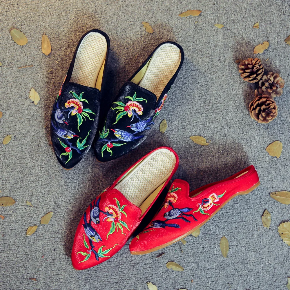 Veowalk Chinese Embroidered Women Silk Cotton Close Pointed Toe Mules Slippers Summer Autumn Vintage Ladies Slip On Flat Shoes